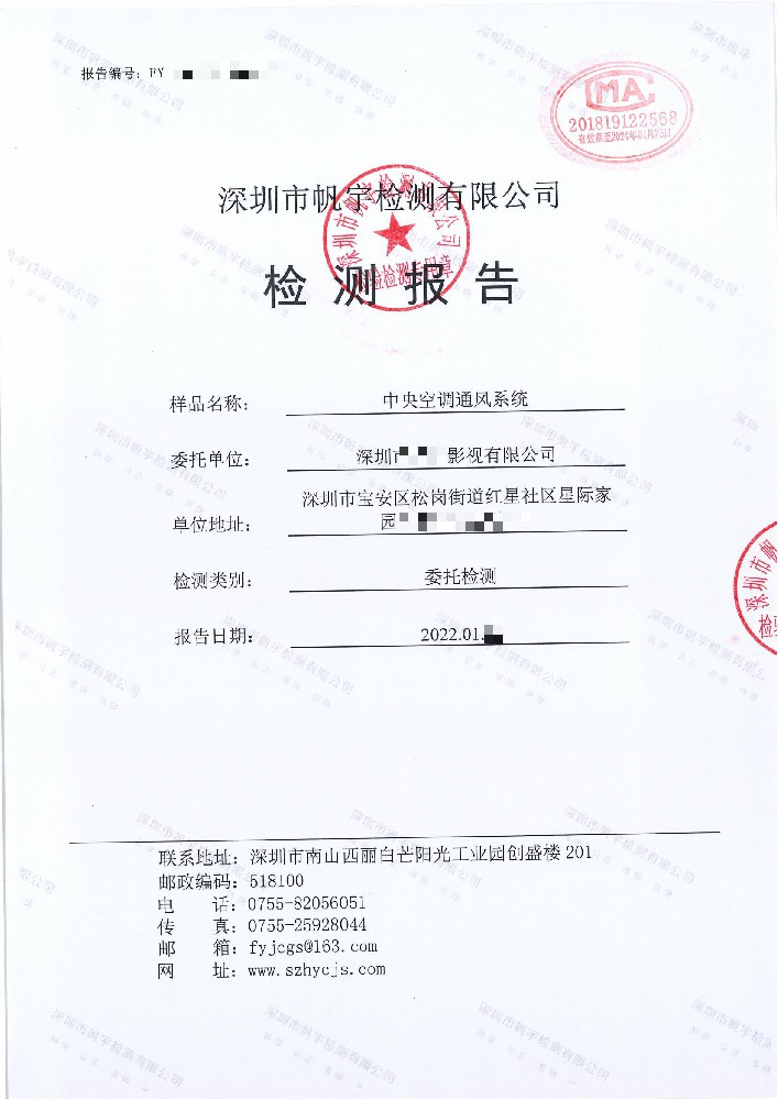 项目简介客户名称:深圳市XX影视有限公司检测地址:深圳市宝安区松岗街道红星社区星际家园X栋检测时间:2022年1月检测标准:《公共场所集中空调通风系统卫生规范》WS 394-2012检测周期:10个工作日检测项目空调通风系统:公共场所:室内新风量送风口:可吸入颗粒物,细菌总数,真菌总数,溶血性链球菌风管:内表面积尘量,内表面微生物···